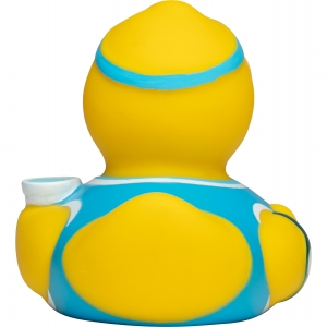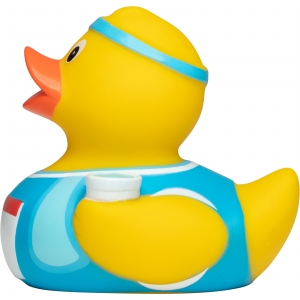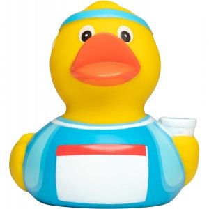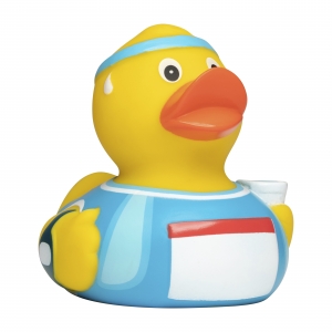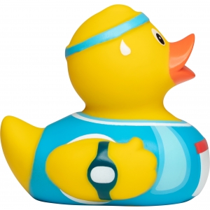 Artikel-Nr: GUT31148Die Sportskanone im hellblauen Trikot mit farblich passendem Stirnband gibt alles, um ganz vorne dabei zu sein. Den Puls im Blick und ein Becher Wasser zur Erfrischung, kann auch der Schweißtropfen an der Stirn die Quietsche-Ente Marathon nicht bremsen. Zur Belohnung ihrer Ausdauer freut sie sich auf ein entspannendes Bad.