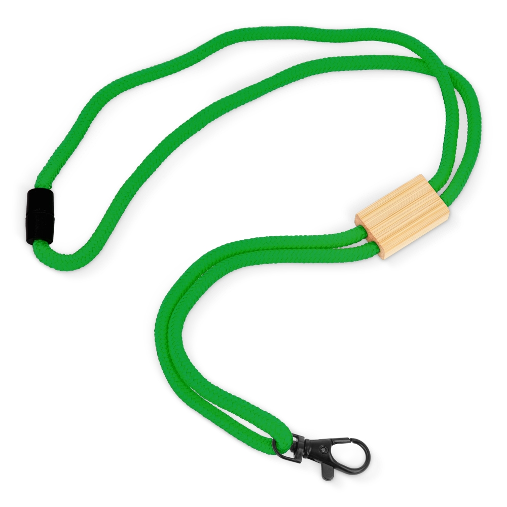 Artikel-Nr: ART95306N0031Kordel-Lanyard aus R-PET Paracord mit Kunststoff-Sicherheitsverbindung und schwarzem Karabiner und Panikverschluss. Das Schlüsselband ist mit einem Bambusschieber verstellbar, der viel Platz für das Branding bietet.