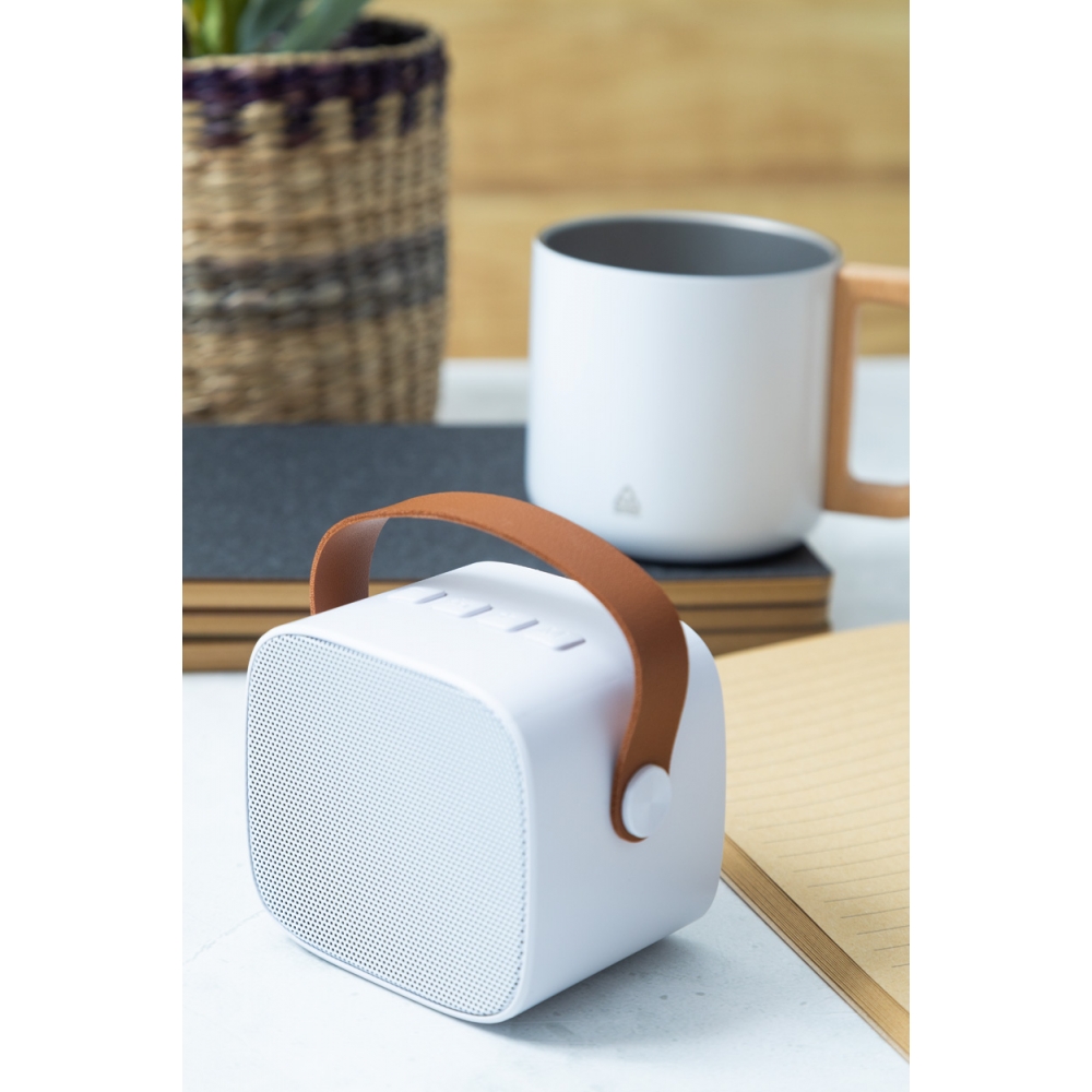Artikel-Nr: AND864094-01Kabelloser Lautsprecher aus recyceltem ABS mit PU-Leder-Trageriemen und eingebautem Akku (1200 mAh). Inklusive USB-Ladekabel.