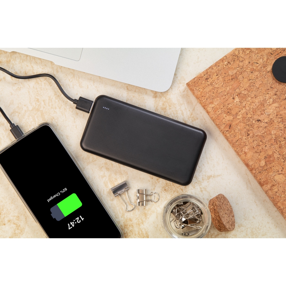 Artikel-Nr: AND864049-10Powerbank aus recyceltem ABS Kunststoff mit 10000 mAh Akku, 2 USB und 1 USB-C Ladeports, Mikro USB und USB-C Eingangsports. Inkl. USB-Ladekabel.