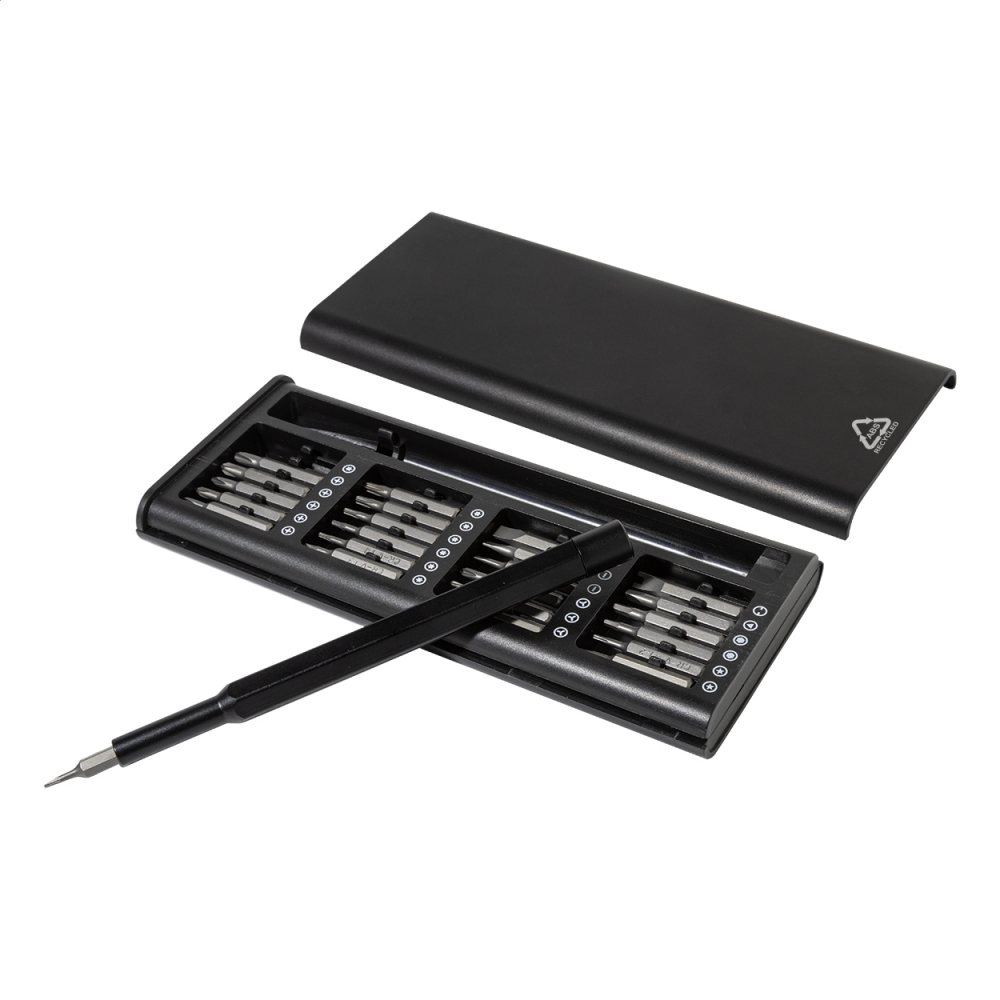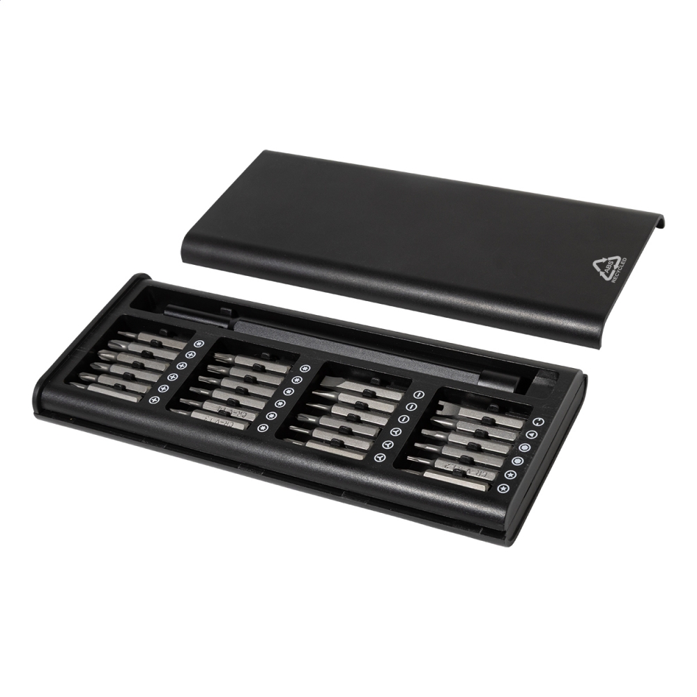 Artikel-Nr: AND800297-10Präzisionsschraubendreher-Set mit 24 Bits im recycelten ABS-Koffer. Der Griff verfügt über eine magnetische Bitaufnahme für schnellen und sicheren Bitwechsel.