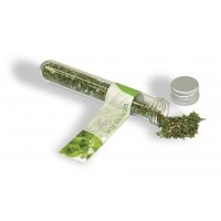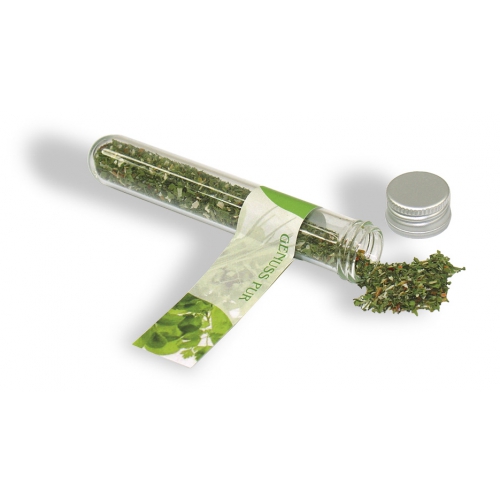 Inhalt: Reagenzgläschen mit Schraubdeckel, gefüllt mit 4 g Salatkräuter 'Altdeutsche Art', inklusive einem Anhängefähnchen.