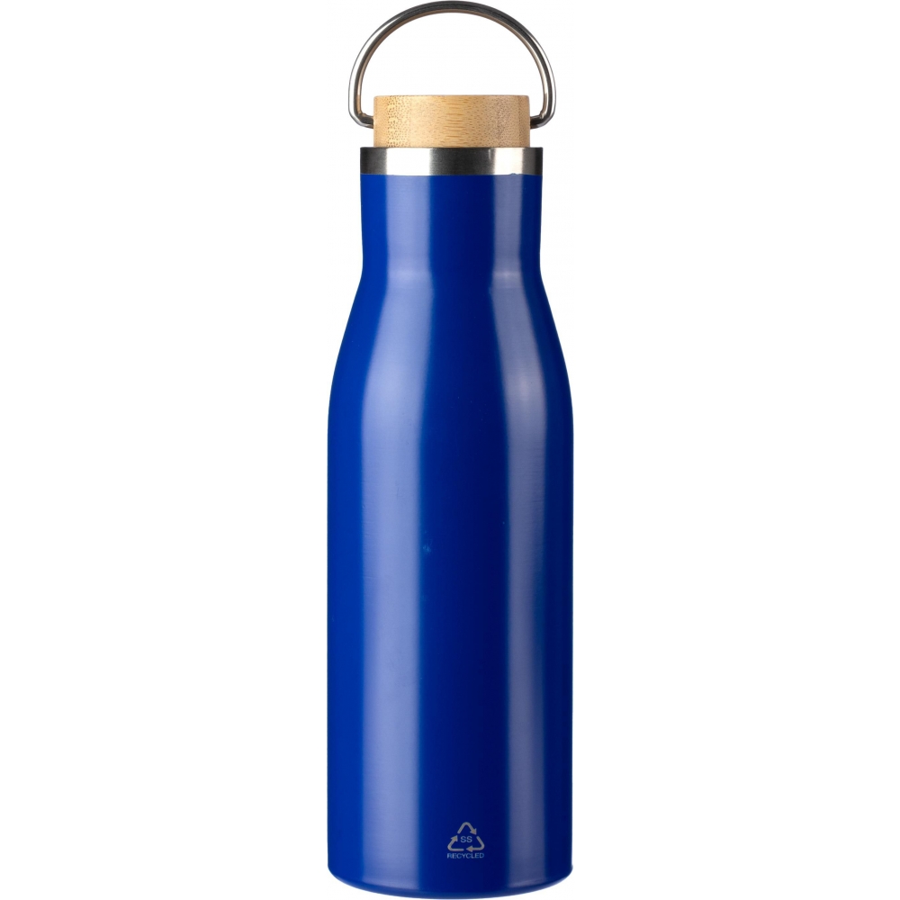 Artikel-Nr: GIV1096834010Trinkflasche aus recyceltem Edelstahl (500 ml), doppelwandig mit Bambusdetail im Deckel und Trageschlaufe. Innen aus Edelstahl 304 und außen aus Edelstahl 201. Inklusive Logo aus recyceltem Edelstahl auf der Flasche. Verpackt pro Stück in einer braunen Kartonverpackung.