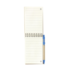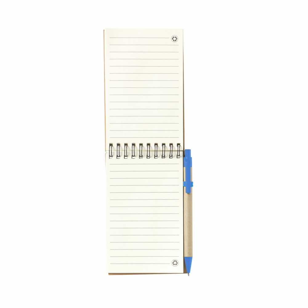 Artikel-Nr: CLP263641-005Notizbuch aus recyceltem Material, mit ca. 70 Blatt/140 Seiten cremefarbenem, liniertem Papier (70 g / m²) und Kartonumschlag mit elastischem Verschluss. Gebunden mit einer stabilen Spiralbindung aus Metal. Inkl. blauschreibendem Kugelschreiber. FSC Mix zertifiziert.