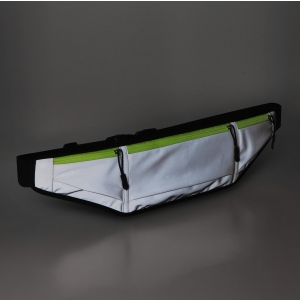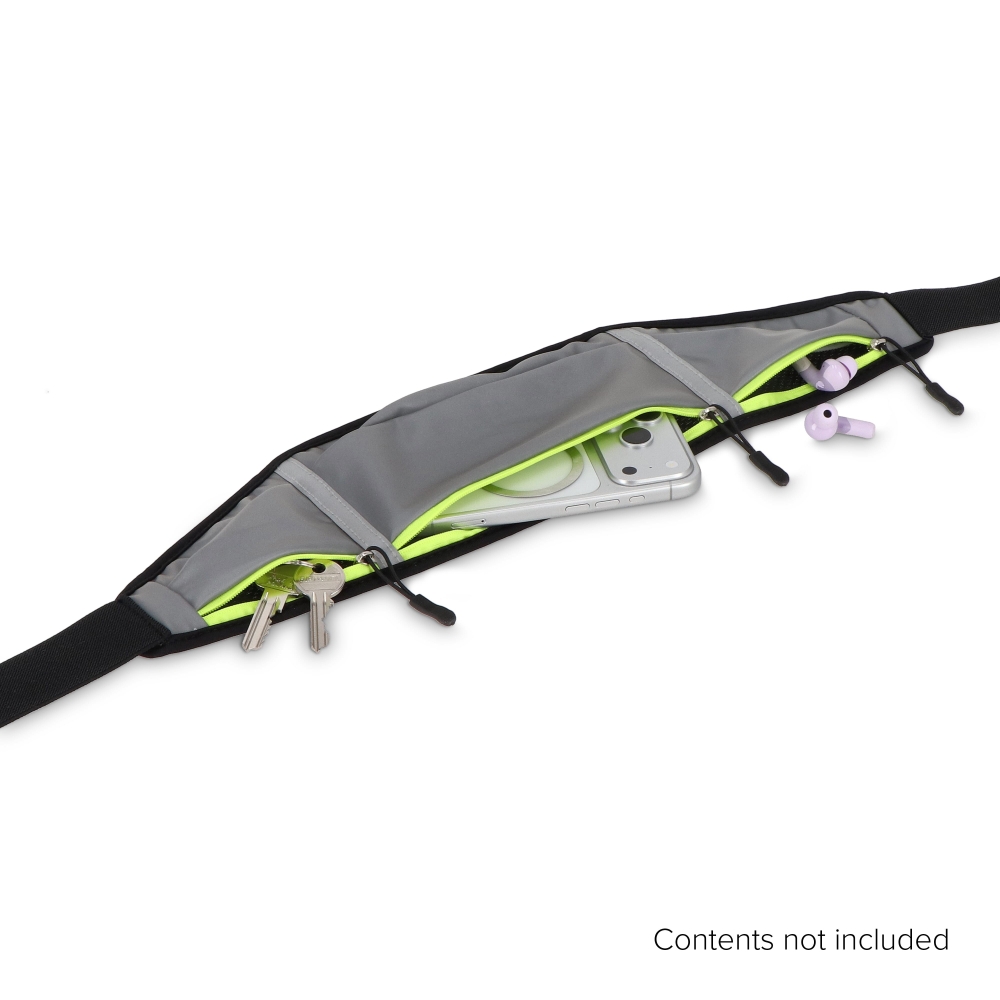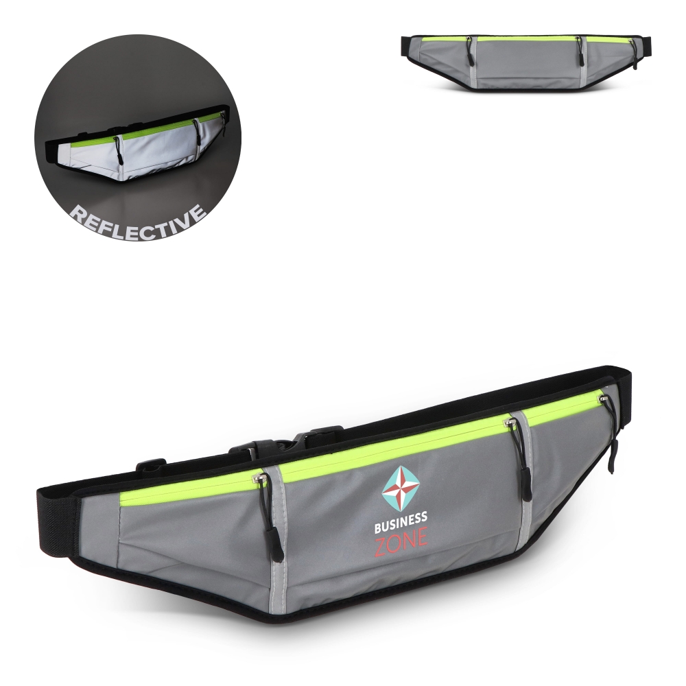Artikel-Nr: ART95325N0061Reflektierende Laufgürteltasche mit neongelbem Reißverschluss. Ein Hauptfach und zwei Seitentaschen für Handy, Schlüssel, Snacks oder Taschentücher. Netzrücken für Atmungsaktivität und elastischer Bund (80–106 cm) für einen sicheren, bequemen Sitz beim Laufen.