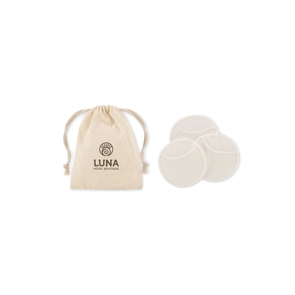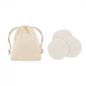 Artikel-Nr: OCBMO2435-133 weiche, wiederverwendbare und waschbare Reinigungspads (Ø 8cm) aus 70% Bambusfaser und 30% Baumwolle. Lieferung im Baumwollbeutel mit Kordelzug.