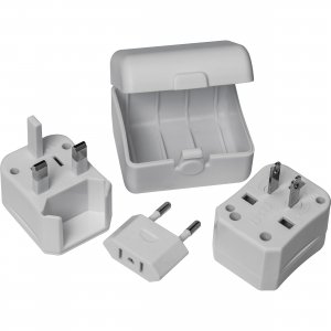 Reiseadapter in einem Kunststoffetui mit Adaptern für US, UK, AUS, Asien und EU