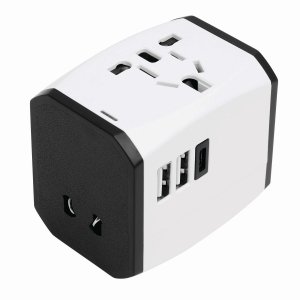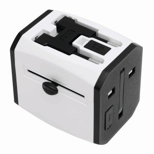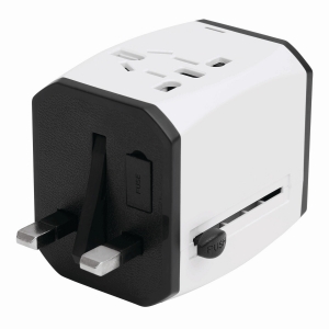 Artikel-Nr: INP56-0402712Reiseadapter TRAVEL POWER: mit Umschaltregler für UK, Europa, USA, Australien und Asien (nicht geeignet für die Schweiz), ausklappbare Stecker, mit 3 USB-Ladeanschlüssen (2 Ports USB Typ A und 1 Port USB Typ C, Gesamt-Ausgangsleistung max. 2,4 A) für z. B. Smartphone, Tablets etc., nur für nicht geerdete Geräte zu verwenden, in Box