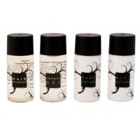 Reiseset bestehend aus 4 Flaschen á 30ml mit Standardaufdruck (Shampoo, Body Lotion, Hand Lotion, Duschgel) inkl. individuell bedruckten 4c Einleger