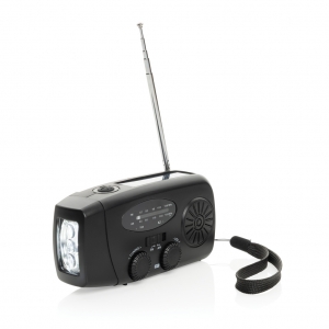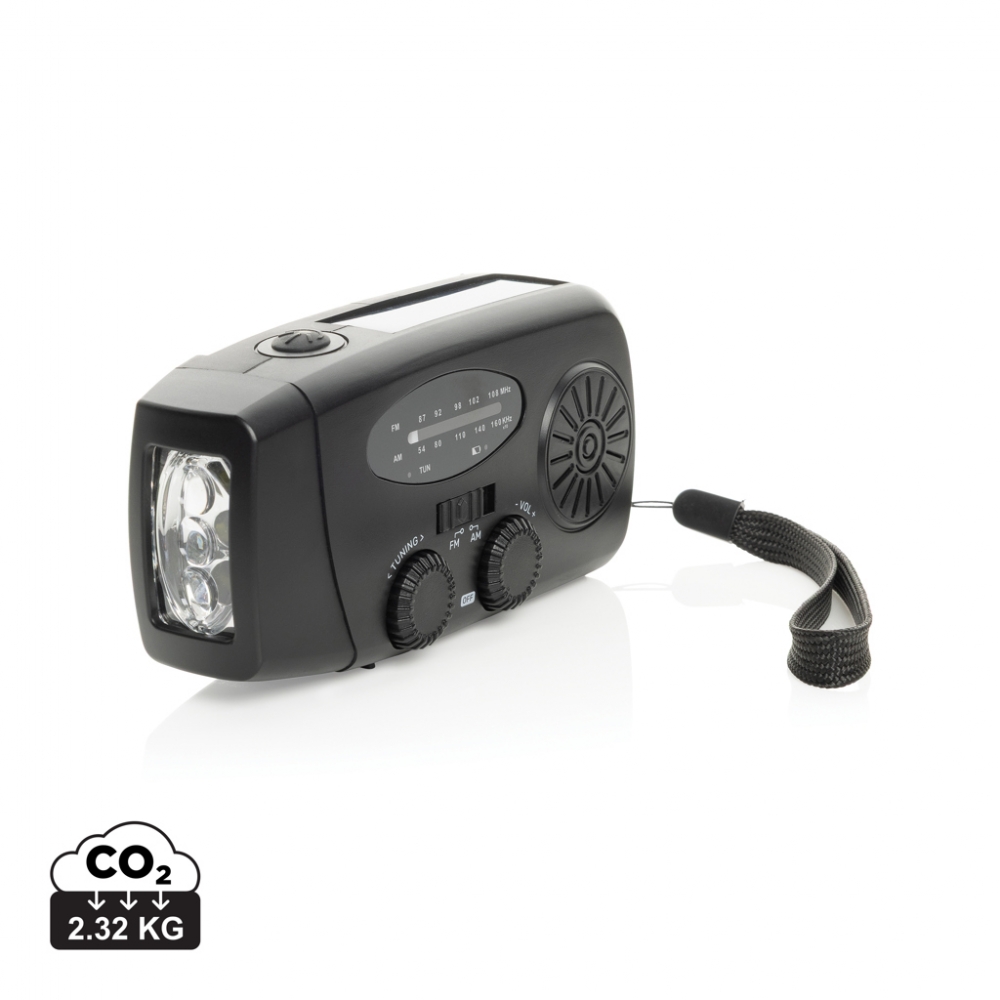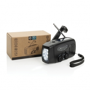 Artikel-Nr: XND3264301Mit RescueWave, einem vielseitigen Notfallradio, sind Sie für jede Situation gerüstet. Mit AM / FM-Radio, Solarpanel, integrierter 1W-Taschenlampe, USB-Output und USB-C-Input sorgt dieses kompakte Gerät dafür, dass Sie für unerwartete Momente gerüstet sind. Mit einem integrierten 1.800mAh-Akku kann RescueWave Ihr Smartphone aufladen und liefert so wichtige Energie, wenn Sie sie am dringendsten benötigen. Der Handkurbelmechanismus bietet zuverlässige Funktionalität – nur 1min Kurbeln reicht für 5min Radio oder 30min Taschenlampenlicht und macht das Gerät zu einem unverzichtbaren Begleiter für Notfälle. Hergestellt aus RCS-zertifiziert recycelten Materialien, darunter recycelter ABS-Kunststoff. RCS (Recycled Claim Standard) ist ein Standard zur Überprüfung des Recyclinganteils eines Produkts über die gesamte Lieferkette hinweg. Gesamtanteil an recycelten Materialien: 26% bezogen auf das Gesamtgewicht des Artikels. Artikel & Zubehör sind PVC-frei und in einer FSC®-Verpackung verpackt.