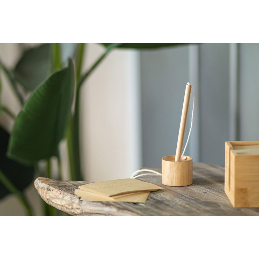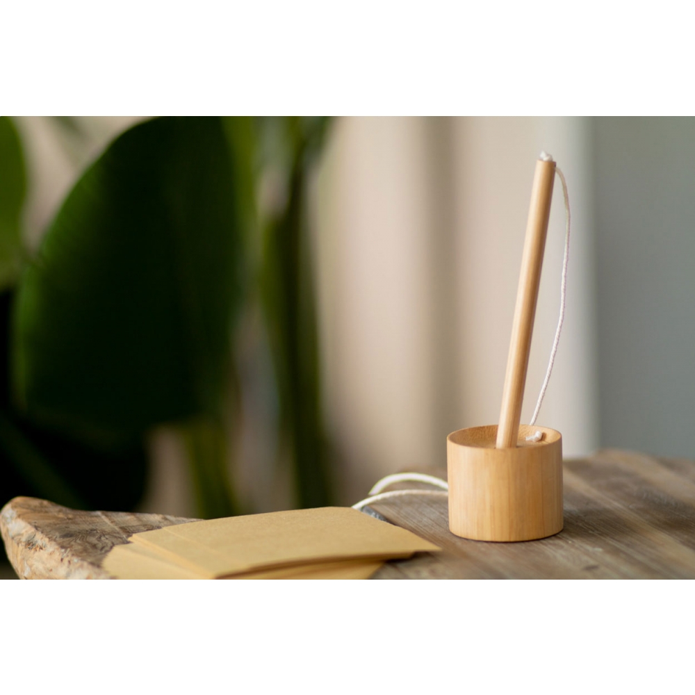 Artikel-Nr: AND800485Rezeptionskugelschreiber (blauschreibend) aus Bambus mit selbstklebendem Stiftehalter. Der Stift ist mittels Baumwollkordel an den Halter befestigt.