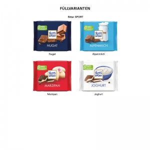 Füllvarianten: 1 Tafel RItter SPORT Nugat oder 1 Tafel RItter SPORT Alpenmilch oder 1 Tafel RItter SPORT Marzipan oder 1 Tafel RItter SPORT Joghurt