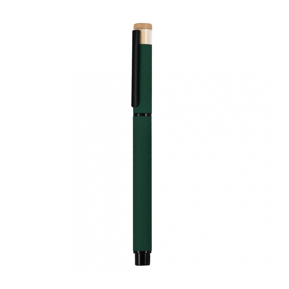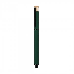 Artikel-Nr: KTO22304004000Elegante Walze aus Bambus und recyceltem Aluminium. Mit einem gummiartigen Korpus. Schwarzer Clip und Griff. Mit Jumbo-Patrone, in blauer Tinte und mit Haubenverschluss. Mit markantem Logo aus recyceltem Aluminium.