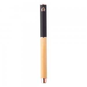 Artikel-Nr: AND809617-10Tintenroller aus Bambus und recyceltem Aluminium mit gummierter Kappe und roségoldenen Elementen. Mit Spezialbeschichtung für Spiegelgravur in Roségold, blauschreibend.