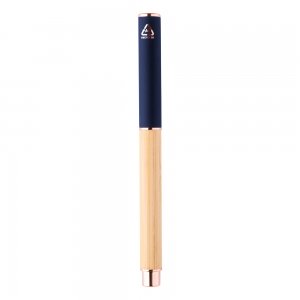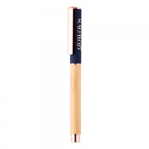 Artikel-Nr: AND809617-06Tintenroller aus Bambus und recyceltem Aluminium mit gummierter Kappe und roségoldenen Elementen. Mit Spezialbeschichtung für Spiegelgravur in Roségold, blauschreibend.