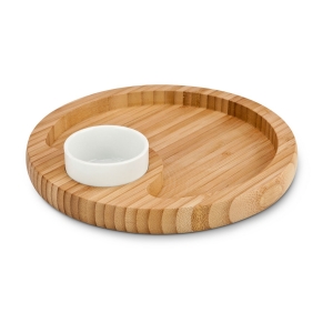 Artikel-Nr: ROPRX2223Runde Bambusschale mit asymmetrisch platziertem Keramikschälchen (ca. Ø 5,7 x 2,9 cm), stilvolle Form- und Materialkombination zum ästhetischen Servieren von Snacks und Dips (Bambus, Keramik)