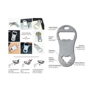 Artikel-Nr: ROPST1003Die praktischen ROMINOX© Multitools gibt es jetzt auch als schlanke Einkaufswagenlöser für den Schlüsselbund! Klein, leicht und doch vielseitig überzeugen die neuen Shop Tools im Alltag. Robuster Werkzeugstahl, inkl. Funktionsbeschreibung und Standard-Kartonverpackung, kundenindividuelle Verpackung ab 100 Stück möglich (Werkzeugstahl). Shop Tool als Schlüsselanhänger mit 8 Funktionen: 1 Einkaufswagenlöser, 1 Flaschenöffner, 1 Schlitzschraubendreher, 1 Reifenprofilmesser (1,6 mm), 1 Nagelzieher, 3 Sechskantschlüssel - ab 3‘000 Stück auch als Sonderproduktion mit individueller Form möglich. Sprechen Sie uns an!