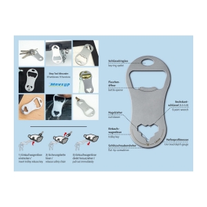 Artikel-Nr: ROPST1003Die praktischen ROMINOX© Multitools gibt es jetzt auch als schlanke Einkaufswagenlöser für den Schlüsselbund! Klein, leicht und doch vielseitig überzeugen die neuen Shop Tools im Alltag. Robuster Werkzeugstahl, inkl. Funktionsbeschreibung und Standard-Kartonverpackung, kundenindividuelle Verpackung ab 100 Stück möglich (Werkzeugstahl). Shop Tool als Schlüsselanhänger mit 8 Funktionen: 1 Einkaufswagenlöser, 1 Flaschenöffner, 1 Schlitzschraubendreher, 1 Reifenprofilmesser (1,6 mm), 1 Nagelzieher, 3 Sechskantschlüssel - ab 3‘000 Stück auch als Sonderproduktion mit individueller Form möglich. Sprechen Sie uns an!