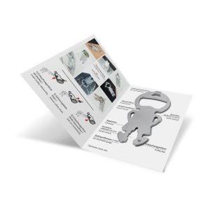 Artikel-Nr: ROPST1001Die praktischen ROMINOX© Multitools gibt es jetzt auch als schlanke Einkaufswagenlöser für den Schlüsselbund! Klein, leicht und doch vielseitig überzeugen die neuen Shop Tools im Alltag. Robuster Werkzeugstahl, inkl. Funktionsbeschreibung und Standard-Kartonverpackung, kundenindividuelle Verpackung ab 100 Stück möglich (Werkzeugstahl). Shop Tool als Schlüsselanhänger mit 11 Funktionen: 1 Einkaufswagenlöser, 1 Flaschenöffner, 1 Schlitzschraubendreher, 2 Reifenprofilmesser (1,6 mm und 4 mm), 1 Nagelzieher, 2 Speichenvierkant, 4 Sechskantschlüssel - ab 3‘000 Stück auch als Sonderproduktion mit individueller Form möglich. Sprechen Sie uns an!