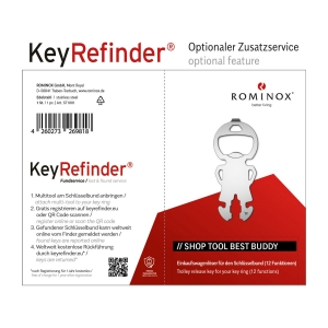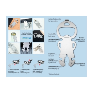 Artikel-Nr: ROPST1001Die praktischen ROMINOX© Multitools gibt es jetzt auch als schlanke Einkaufswagenlöser für den Schlüsselbund! Klein, leicht und doch vielseitig überzeugen die neuen Shop Tools im Alltag. Robuster Werkzeugstahl, inkl. Funktionsbeschreibung und Standard-Kartonverpackung, kundenindividuelle Verpackung ab 100 Stück möglich (Werkzeugstahl). Shop Tool als Schlüsselanhänger mit 12 Funktionen: 1 Einkaufswagenlöser, 1 Flaschenöffner, 1 Schlitzschraubendreher, 2 Reifenprofilmesser (1,6 mm und 4 mm), 1 Nagelzieher, 2 Speichenvierkant, 4 Sechskantschlüssel - ab 3‘000 Stück auch als Sonderproduktion mit individueller Form möglich. Sprechen Sie uns an!
