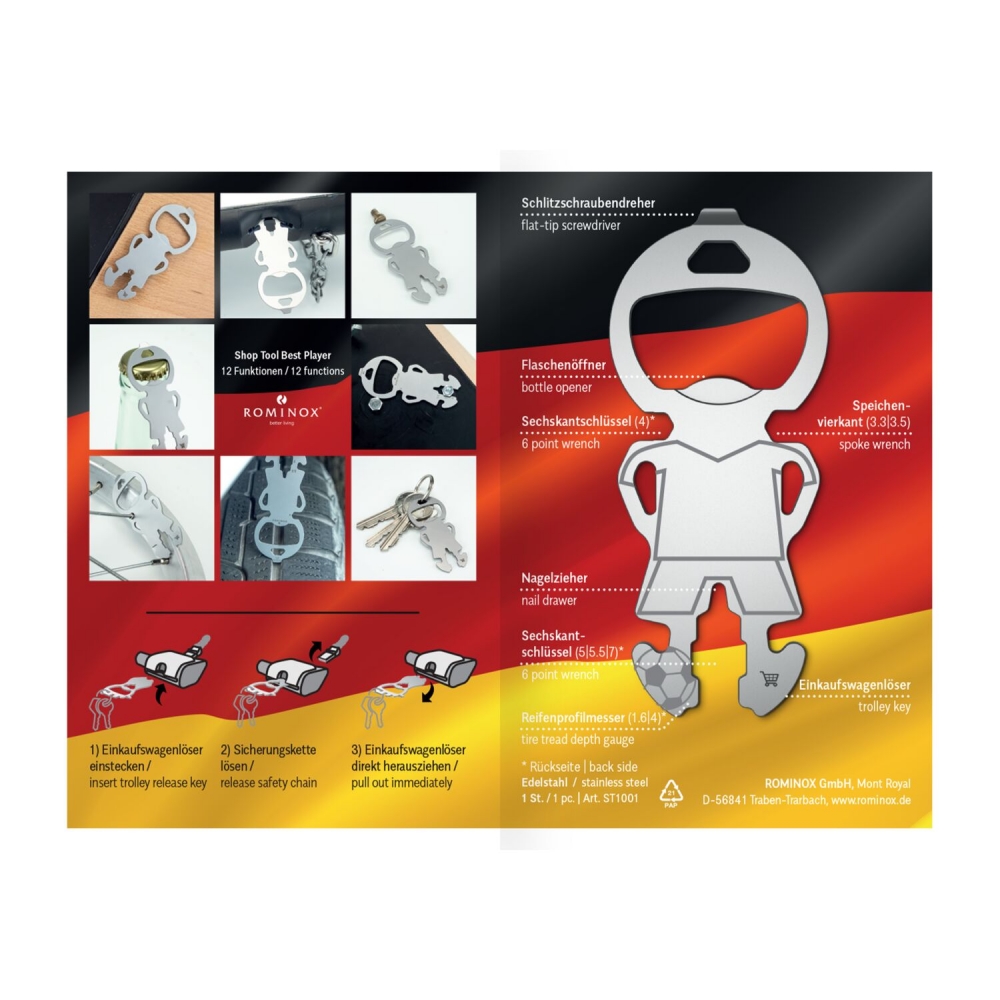 Artikel-Nr: ROPST1001deDen Bestseller aus der ROMINOX© Shoptool Serie gibt es jetzt auch als Fußballspieler-Version. Sie erhalten unseren Best Buddy Einkaufswagenlöser für den Schlüsselbund mit Fußballspieler-Gravur und im Deutschland Mäppchen! Werden Sie zum Trikotsponsor für diesen kleinen Alleskönner. Klein, leicht und doch vielseitig, überzeugen die Shop Tools im Alltag. Robuster Werkzeugstahl, inkl. Funktionsbeschreibung und Standard-Kartonverpackung, kundenindividuelle Verpackung ab 100 Stück möglich (Werkzeugstahl). In drei Designs verfügbar. Shop Tool als Schlüsselanhänger mit 12 Funktionen: 1 Einkaufswagenlöser, 1 Flaschenöffner, 1 Schlitzschraubendreher, 2 Reifenprofilmesser (1,6 mm und 4 mm), 1 Nagelzieher, 2 Speichenvierkant, 4 Sechskantschlüssel - ab 3‘000 Stück auch als Sonderproduktion mit individueller Form möglich. Sprechen Sie uns an!