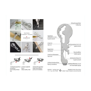Artikel-Nr: ROPST1005Die praktischen ROMINOX© Multitools gibt es jetzt auch als schlanke Einkaufswagenlöser für den Schlüsselbund! Klein, leicht und doch vielseitig überzeugen die neuen Shop Tools im Alltag. Robuster Werkzeugstahl, inkl. Funktionsbeschreibung und Standard-Kartonverpackung, kundenindividuelle Verpackung ab 100 Stück möglich (Werkzeugstahl). Shop Tool als Schlüsselanhänger mit 14 Funktionen: 1 Einkaufswagenlöser, 1 Flaschenöffner, 2 Reifenprofilmesser (1,6 / 4 mm), 1 Nagelzieher, 2 Speichenvierkant, 1 Schlitzschraubendreher, 1 Zentimeter Lineal, 1 Inch Lineal, 4 Sechskantschlüssel - ab 3`000 Stück auch als Sonderproduktion mit individueller Form möglich. Sprechen Sie uns an!