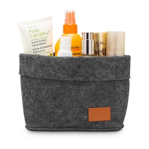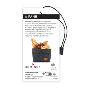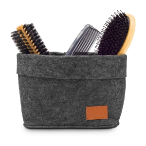 Artikel-Nr: ROPRX2352Hochwertiger Korb aus RPET-Filz in elegantem, dunklem Anthrazit, verwendbar als schicker Korb für Brot, Brötchen oder Gebäck, modernes geradliniges Design mit pfiffiger Krempe und aufgenähtem Badge in Lederoptik (veganer Filz aus 100 % recyceltem PET, zertifiziert nach Global Recycling Standard, Kunstleder)