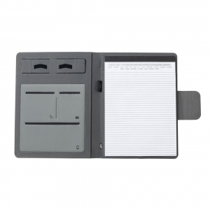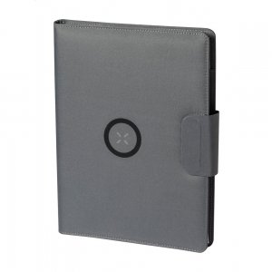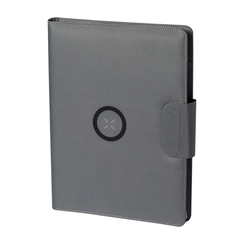 Artikel-Nr: AND722540-77Dokumentenmappe im A4-Format aus 300D-RPET-Polyester mit integriertem Wireless-Fast-Charger (10 W), 5000-mAh-Powerbank mit USB-Ladeanschluss, faltbarem Handyhalter und Notizblock mit 20 linierten Blättern. Inklusive selbstklebendem Metallring zur Nutzung der Magnetfunktion an jedem kabellos aufladbaren Gerät. Inkl. USB-Ladekabel.