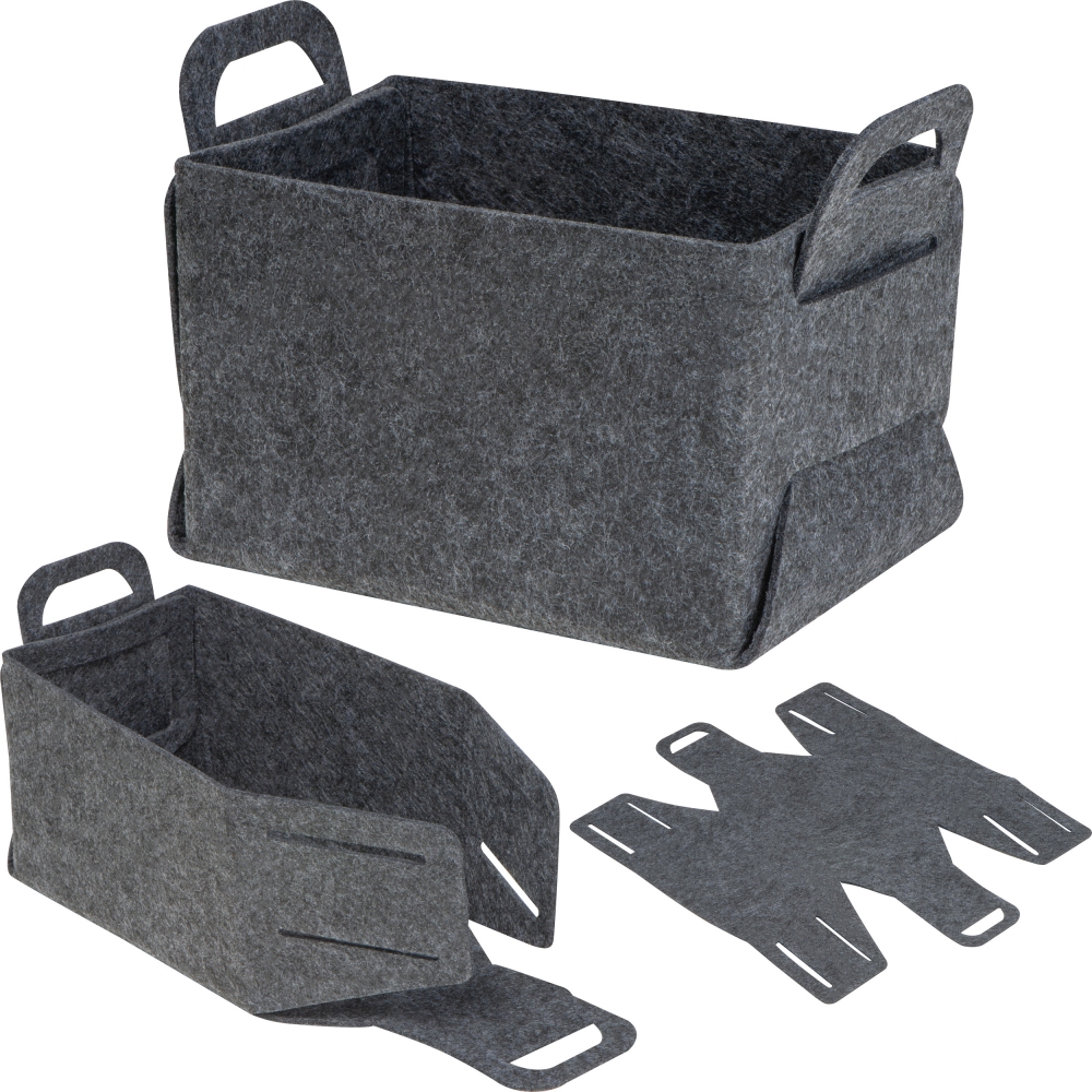 Artikel-Nr: EAG433777Filzkörbchen aus RPET-Filz. Faltbarer Korb mit Griff, verschleißfest und elastisch. Optimal zur Aufbewahrung von Kleinkram. Ihr Logo wird auf eine Seite gedruckt.