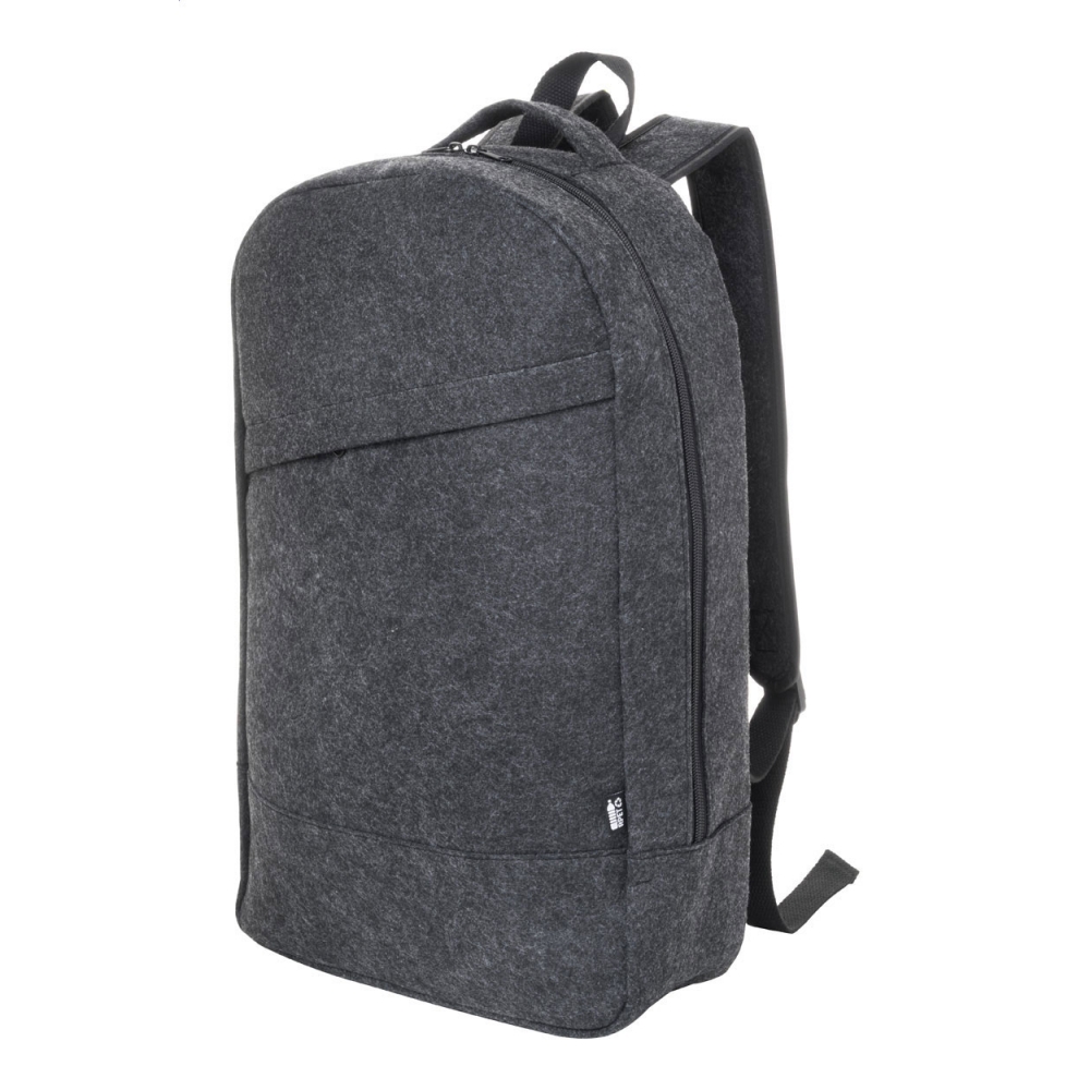 Artikel-Nr: AND800570-80Rucksack aus RPET Filz mit Reißverschluss-Hauptfach, Fronttasche, Laptopfach (15"), Trolley-Befestigungsband und geposterten Schultergurten. Mit RPET-Label.