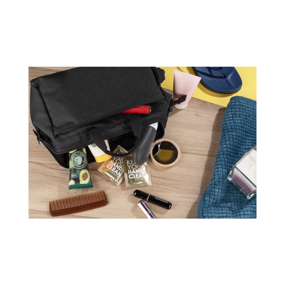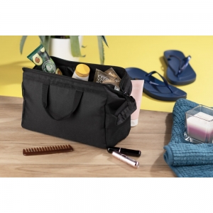 Artikel-Nr: ARD01029-02VERPE-Kosmetiktasche aus strapazierfähigem und beschädigungsbeständigem 300D-rPET-Polyester. Im Inneren gibt es ein größeres Fach und kleine Fächer, die es erlauben, die notwendigsten Dinge zu sortieren. Dies ermöglicht es Ihnen, die Sachen in Ordnung zu halten, und macht sie auch benutzerfreundlicher. An der Außenseite befindet sich eine Reißverschlusstasche. Die Kosmetiktasche verfügt über drei Griffe, wodurch sie äußerst handlich ist.