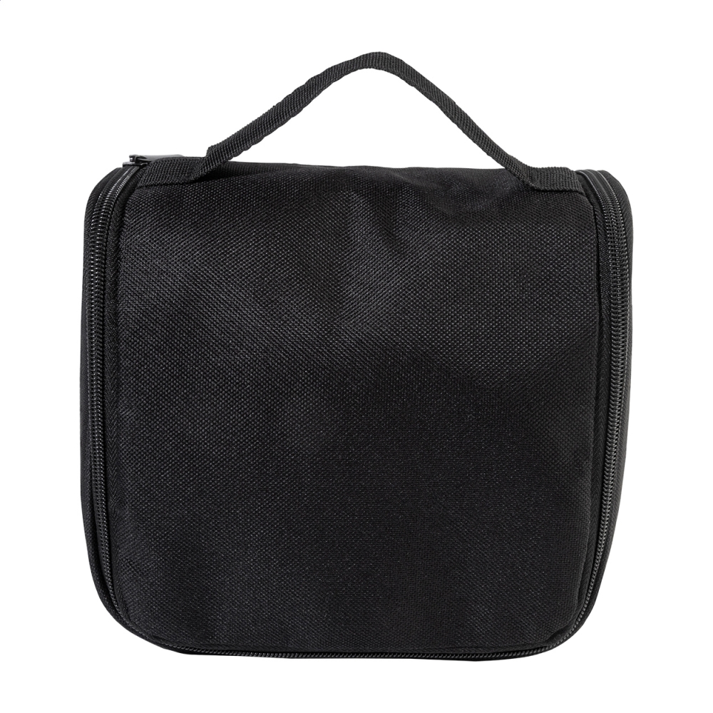 Artikel-Nr: AND800246-10Kosmetiktasche zum Hängen aus RPET mit Reißverschluss-Innenfach sowie Netzfächern. Material: 600D RPET Polyester. Mit Label RPET.