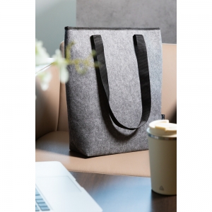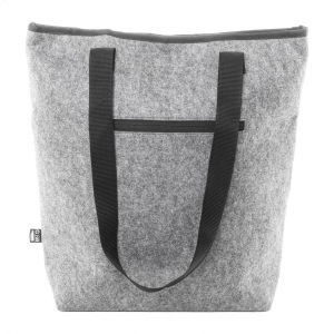 Artikel-Nr: AND808281-77Einkaufs-Kühltasche aus RPET-Filz mit Aluminium-Polsterung. Mit Klettverschluss, Reißverschlusstasche vorne und langen Griffen. Mit RPET-Label.