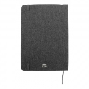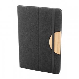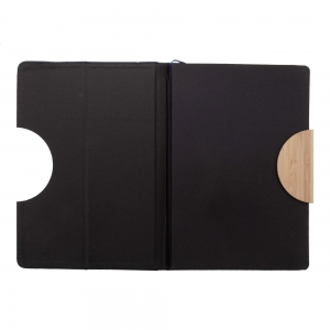 Artikel-Nr: AND800514-10A5 Notizbuch mit Umschlag aus RPET Polyester und Bambuseinlage, Handyhalterfunktion, 80 linierten Seiten aus Recyclingpapier und Gummiband.