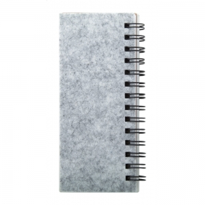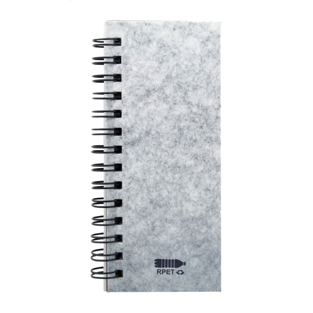Artikel-Nr: AND800767-77Spiralnotizbuch mit RPET-Filzüberzug, 40 linierten Blättern aus Recyclingpapier, 25 Haftnotizen und 125 Seitenmarkern (in 5 verschiedenen Farben).