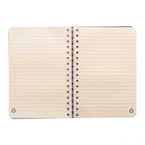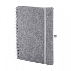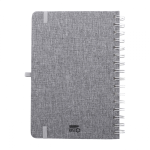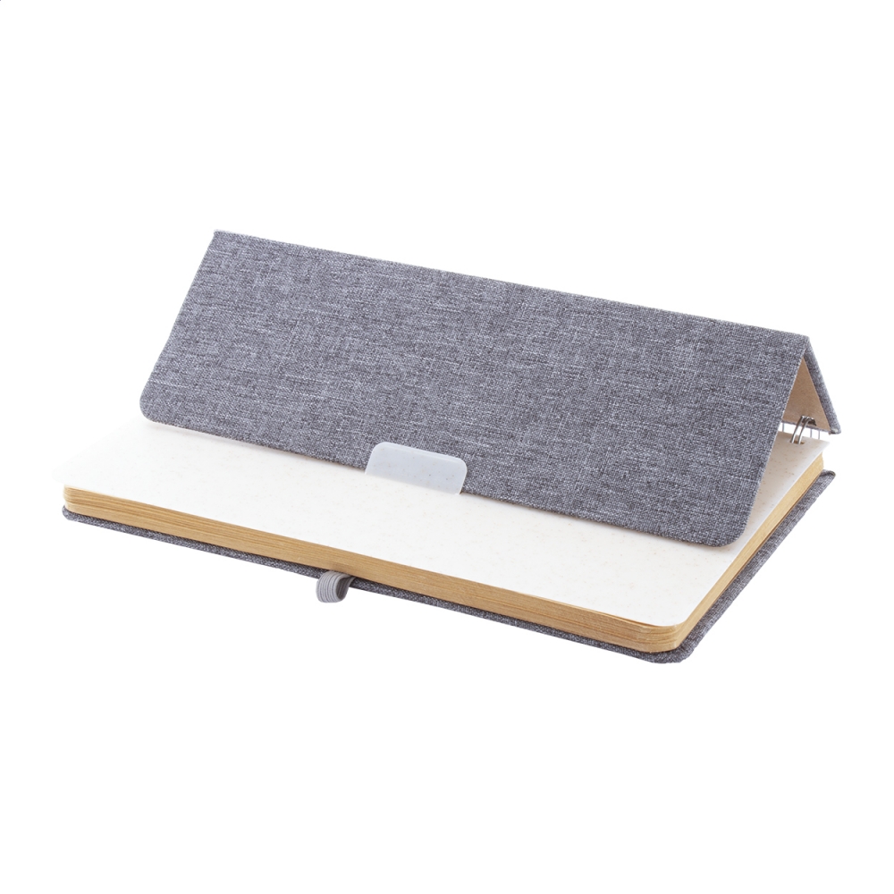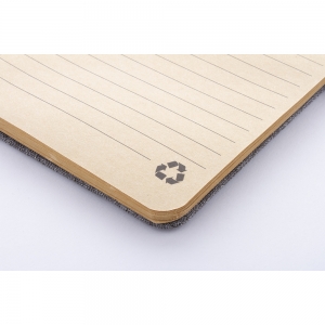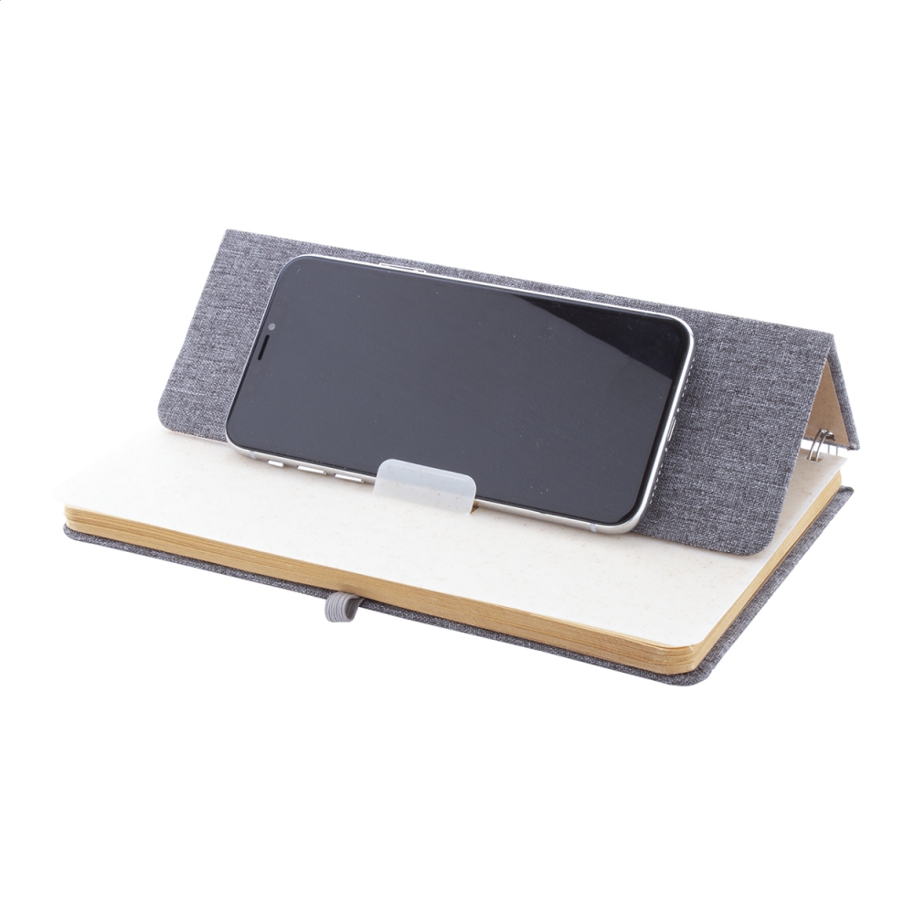 Artikel-Nr: AND800515-77A5 Spiral-Notizbuch mit Umschlag aus RPET Polyester, Handy- und Tablethaltereinsatz aus Weizenstrohkunststoff, 70 linierten Seiten aus recycletem Kraftpapier, Gummiband und Stifteschlaufe.