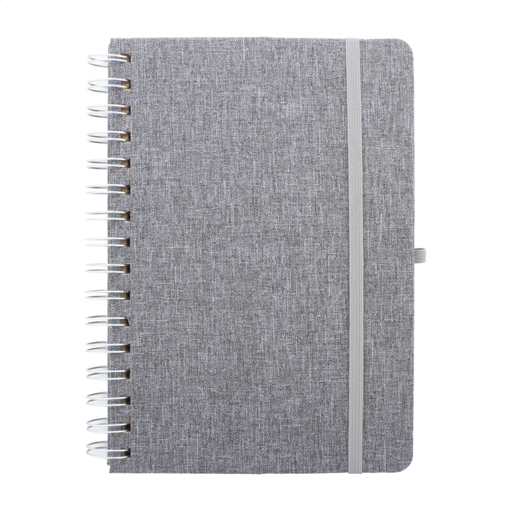 Artikel-Nr: AND800515-77A5 Spiral-Notizbuch mit Umschlag aus RPET Polyester, Handy- und Tablethaltereinsatz aus Weizenstrohkunststoff, 70 linierten Seiten aus recycletem Kraftpapier, Gummiband und Stifteschlaufe.