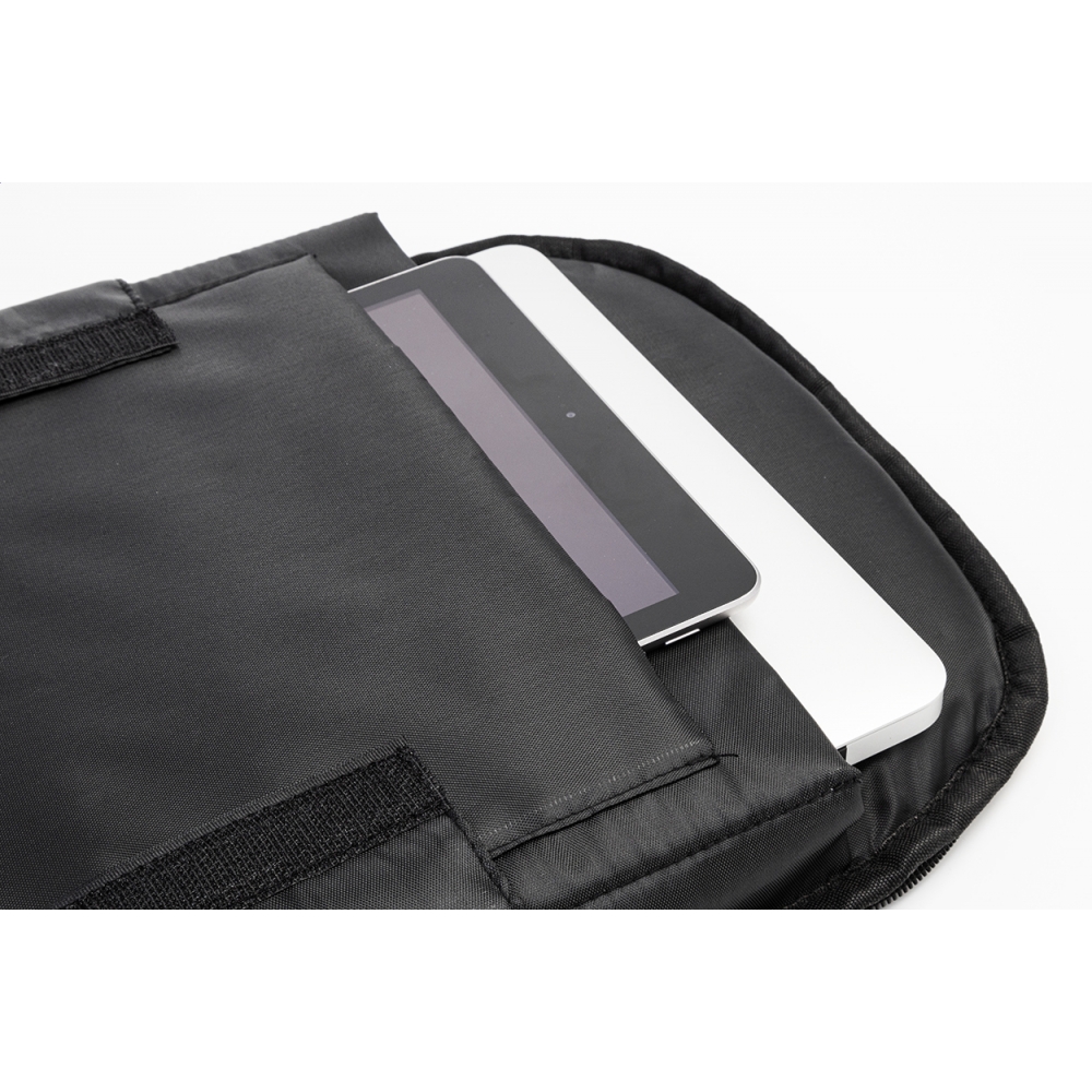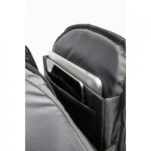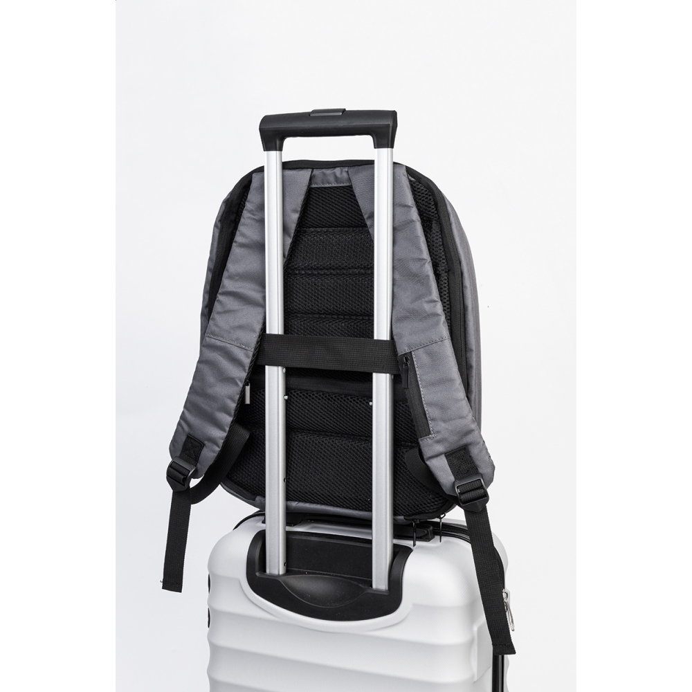 Artikel-Nr: AND800245-77Anti-Diebstahl-Rucksack aus RPET mit Reißverschluss-Hauptfach, gepolstertem Laptop- (15") und Tabletfacht (12"), Trolley-Gurt, gepolsterten Rücken und Schultergurten und verstecktem Anti-Diebstahl-Fach. Material: 300D RPET-Polyester. Mit Label RPET.