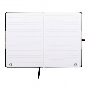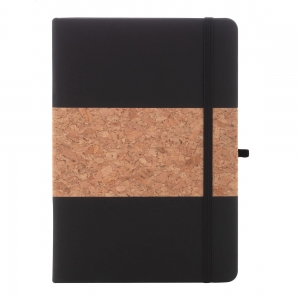 Artikel-Nr: AND800780-10A5 Notizbuch mit Umschlag aus natürlichem Kork und Kunstleder mit farblich abgestimmten Lesezeichen, Gummiband und Stifteschlaufe sowie 80 linierten Seiten aus Recyclingpapier.