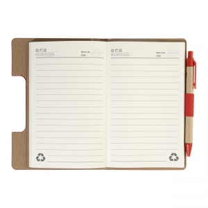 Artikel-Nr: AND800700-05Notizbuch mit Cover aus recyceltem PU-Leder mit 70 linierten Blättern aus Recyclingpapier und 125 Seitenmarkern (in 5 verschiedenen Farben). Inklusive Kugelschreiber aus Recyclingpapier und recyceltem PP mit blauer Mine.
