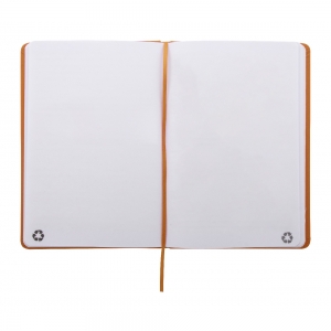 Artikel-Nr: AND800765-03Notizbuch mit recyceltem PU-Lederbezug und 100 blanko Blättern aus Recyclingpapier. Mit farblich passendem Lesezeichen und Gummiband. A5-Größe.