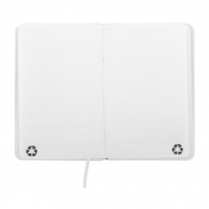 Artikel-Nr: AND800766-01Notizbuch mit recyceltem PU-Lederbezug und 100 blanko Blättern aus Recyclingpapier. Mit farblich passendem Lesezeichen und Gummiband. A6-Größe.