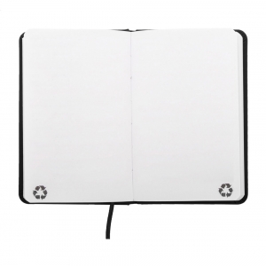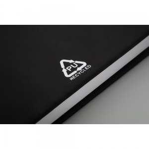 Artikel-Nr: AND800766-10Notizbuch mit recyceltem PU-Lederbezug und 100 blanko Blättern aus Recyclingpapier. Mit farblich passendem Lesezeichen und Gummiband. A6-Größe.