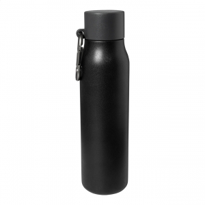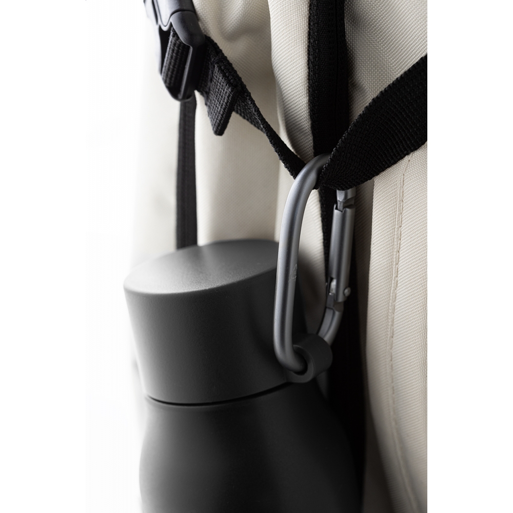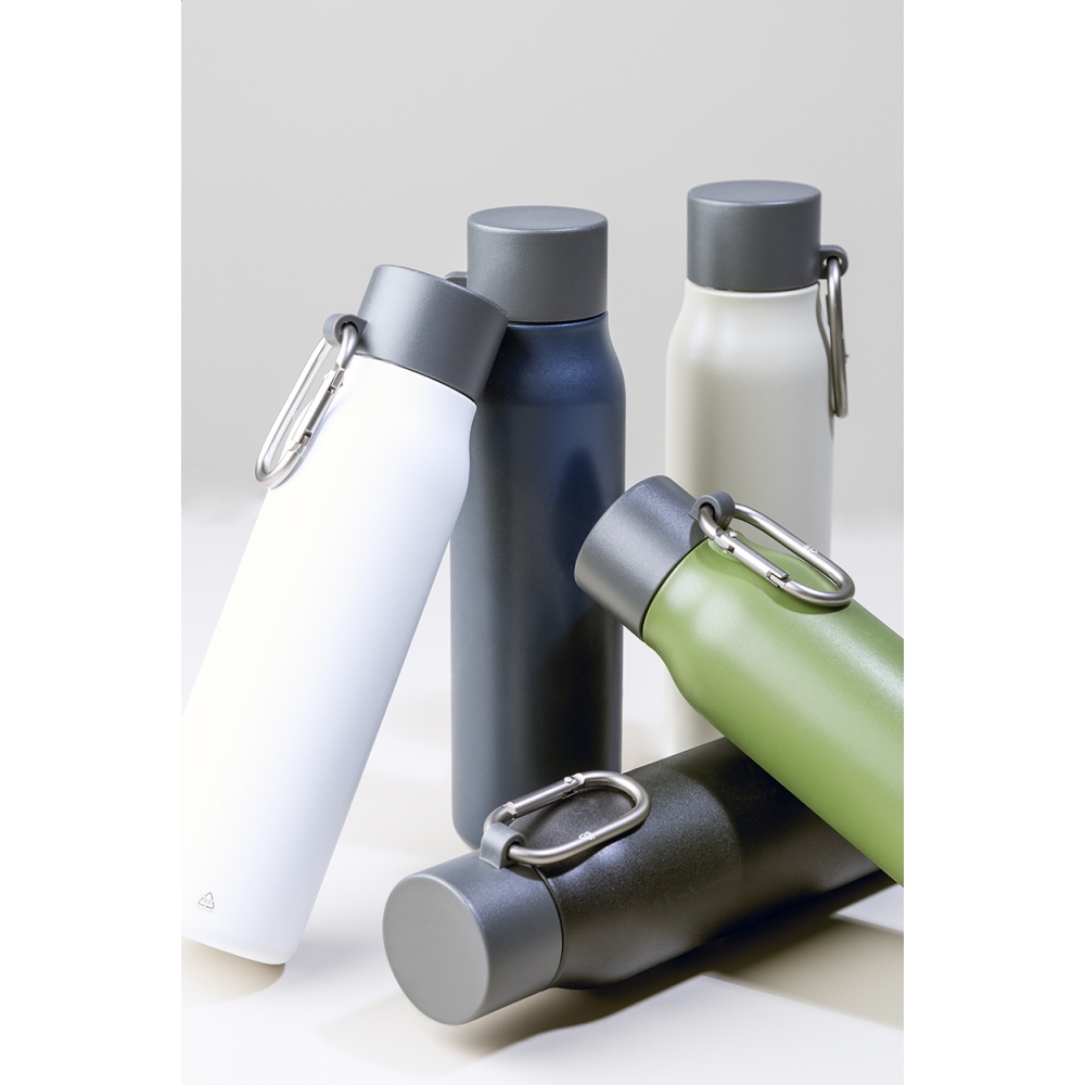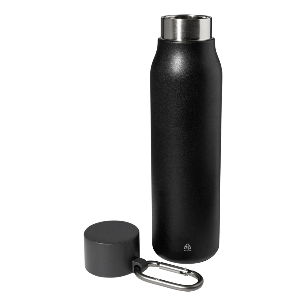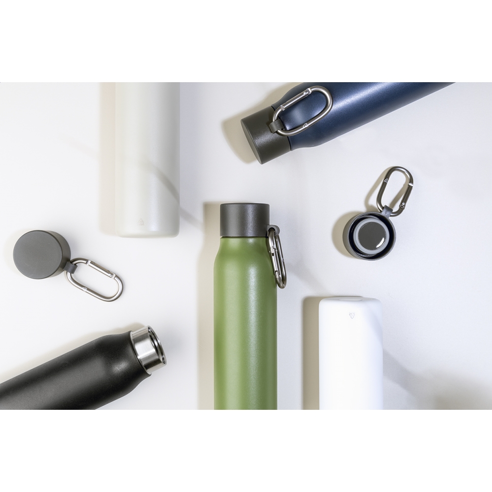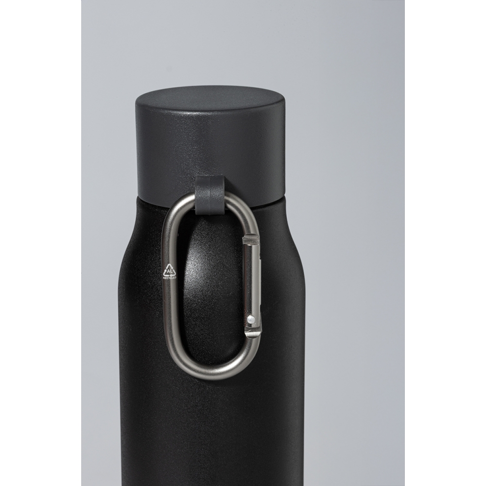 Artikel-Nr: AND800142-10Doppelwandige, isolierte Vakuumflasche aus recyceltem Edelstahl mit PP-Deckel und Karabiner aus recyceltem Aluminium. Füllmenge: 500 ml.