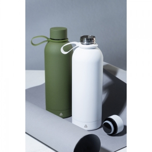 Artikel-Nr: AND800158-01Doppelwandige, vakuumisolierte Flasche aus recyceltem Edelstahl mit gummierter Oberfläche und Tragegriff aus Silikon. Füllmenge: 500 ml.