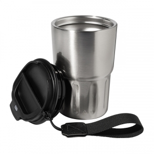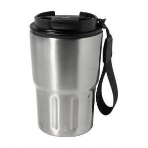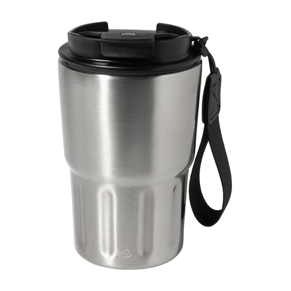 Artikel-Nr: AND800667-21Doppelwandiger Isolierbecher aus recyceltem Edelstahl mit Trinkdeckel aus PP-Kunststoff und Trageschlaufe aus RPET-Polyester. Füllmenge: 350 ml.