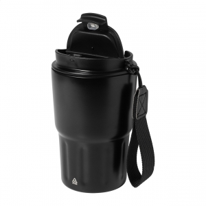 Artikel-Nr: AND800667-10Doppelwandiger Isolierbecher aus recyceltem Edelstahl mit Trinkdeckel aus PP-Kunststoff und Trageschlaufe aus RPET-Polyester. Füllmenge: 350 ml.