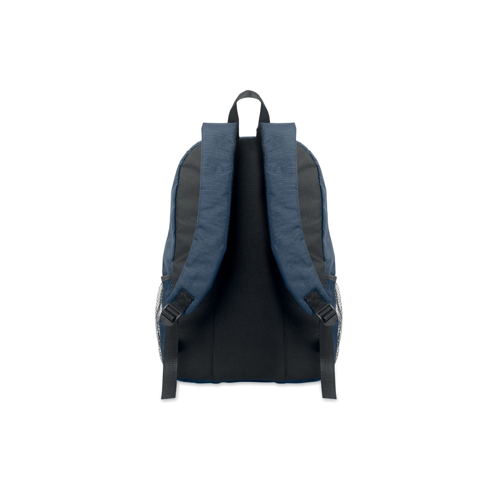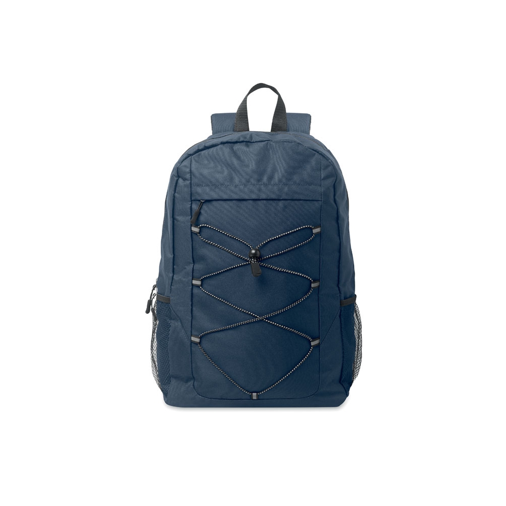 Rucksack mit Schnürung. Fronttasche mit Reißverschluss. Netztaschen auf beiden Seiten. 600D RPET-Polyester.