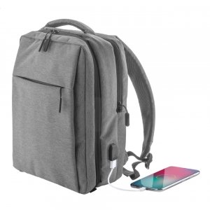 Artikel-Nr: AND810432-80Wasserdichter Rucksack mit mehreren Reißverschlussfächern, gepolstertem Laptop- (15") und Tabletfach, ergonomischen Rücken und Schultergurten, Anti-Diebstahl-Tasche, Trolleygurt und eingearbeiteter USB-Verbindung für Powerbanks. Matieal: 300D Oxford-Polyester.
