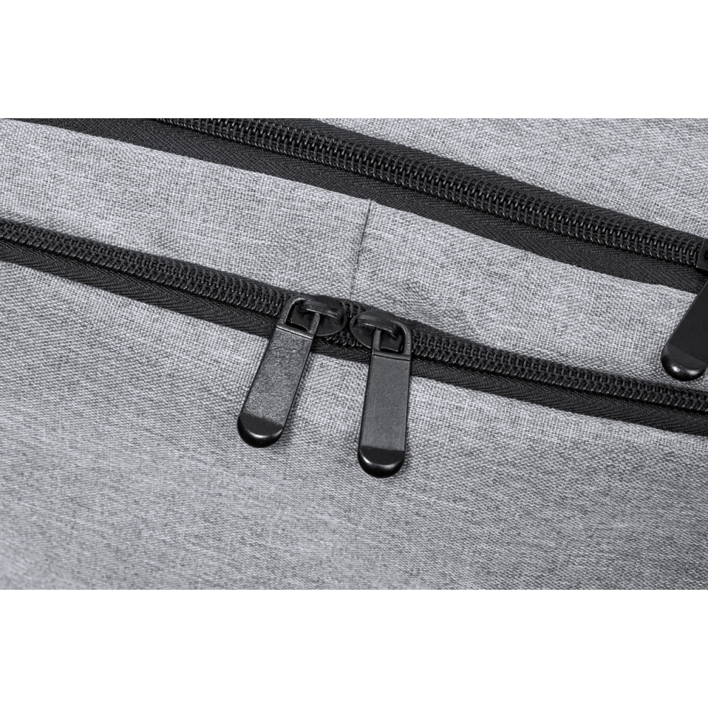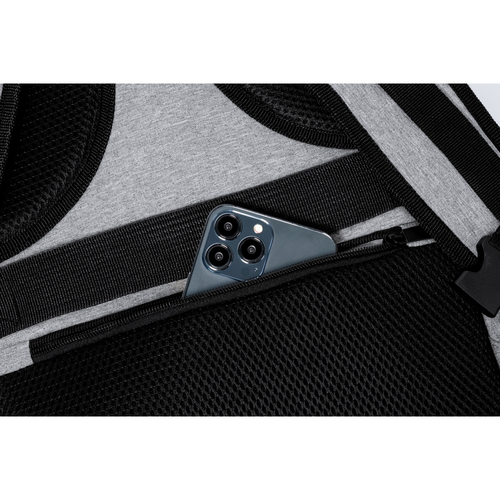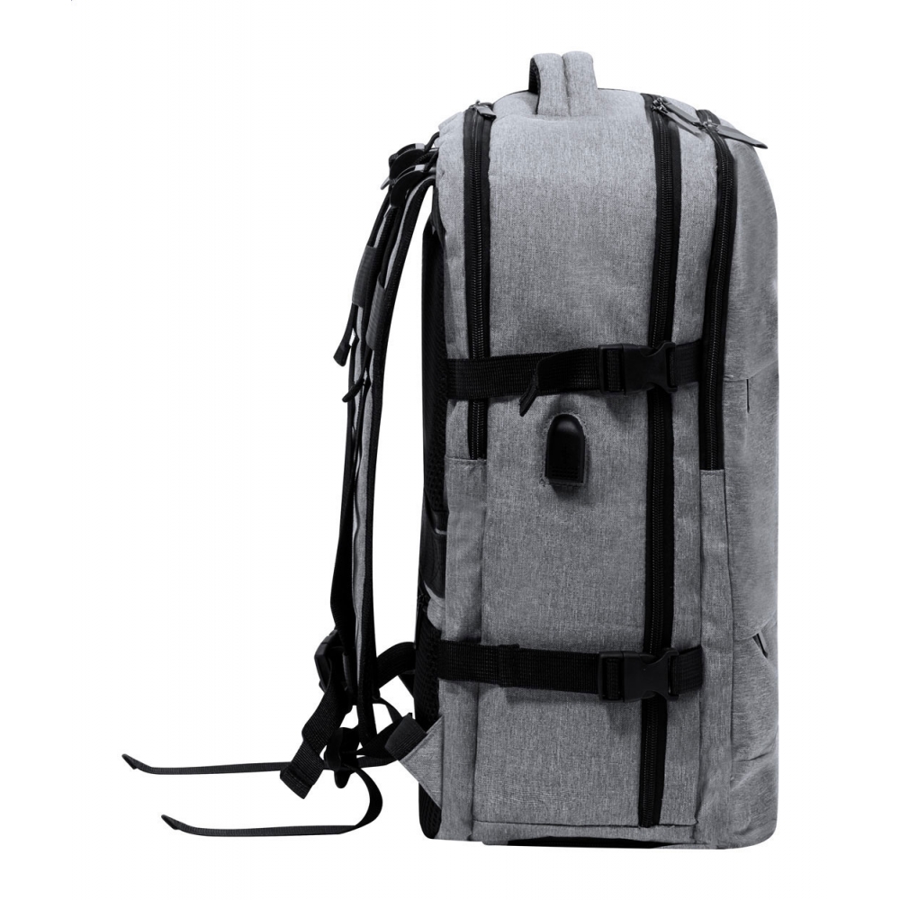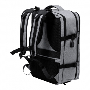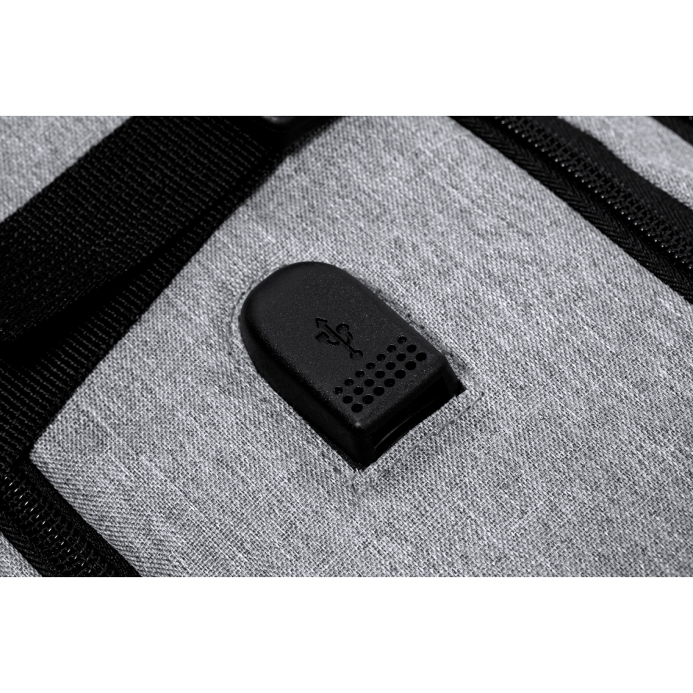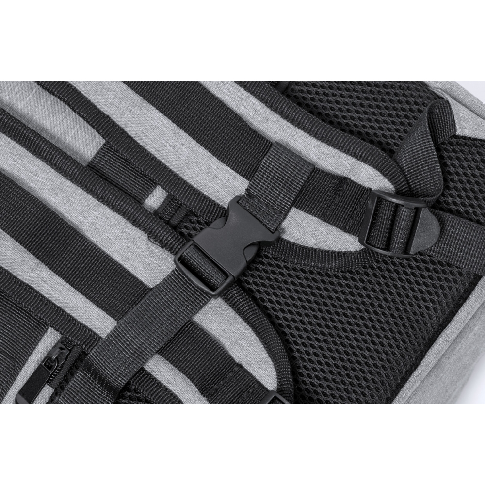 Artikel-Nr: AND733472-77Wasserabweisender RPET-Rucksack mit 3 Hauptfächern mit Reißverschluss, 2 Fronttaschen mit Reißverschluss, Seitentasche mit Reißverschluss und versteckter Diebstahlschutztasche. Mit gepolstertem Laptop- (17") und Schuhfach, gepolstertem Rücken und Schultergurten. Mit Trolley-Gurt und integriertem USB-Anschluss für Powerbanks. 300D RPET-Polyester mit markantem RPET-Label.